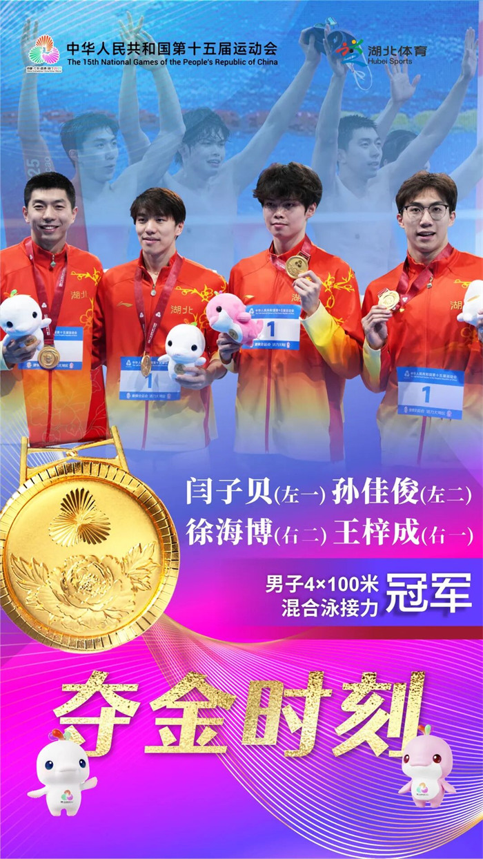 11月17日晚在第十五届全运会男子4×100米混合泳接力决赛中,宜昌市体校输送运动员、2024巴黎奥运会冠军孙佳俊与队友王梓成、闫子贝、徐海博紧密配合,助力湖北队以3分34秒39的绝对优势摘得冠军这也是湖北游泳首次夺得该项目冠军。 当日上午,骆铭佩、闫子贝、黄梓淳、张子扬代表湖北队出战男子4×100米混合泳接力预赛,以3分42秒73的成绩晋级决赛。晚上,在男子4×100米混合泳接力决赛中,王梓成、闫子贝、孙佳俊、徐海博代表湖北队出战。比赛中,前两棒队友一路领先,第三棒蝶泳的孙佳俊也是率先完成交接棒。最终,湖北队摘冠。