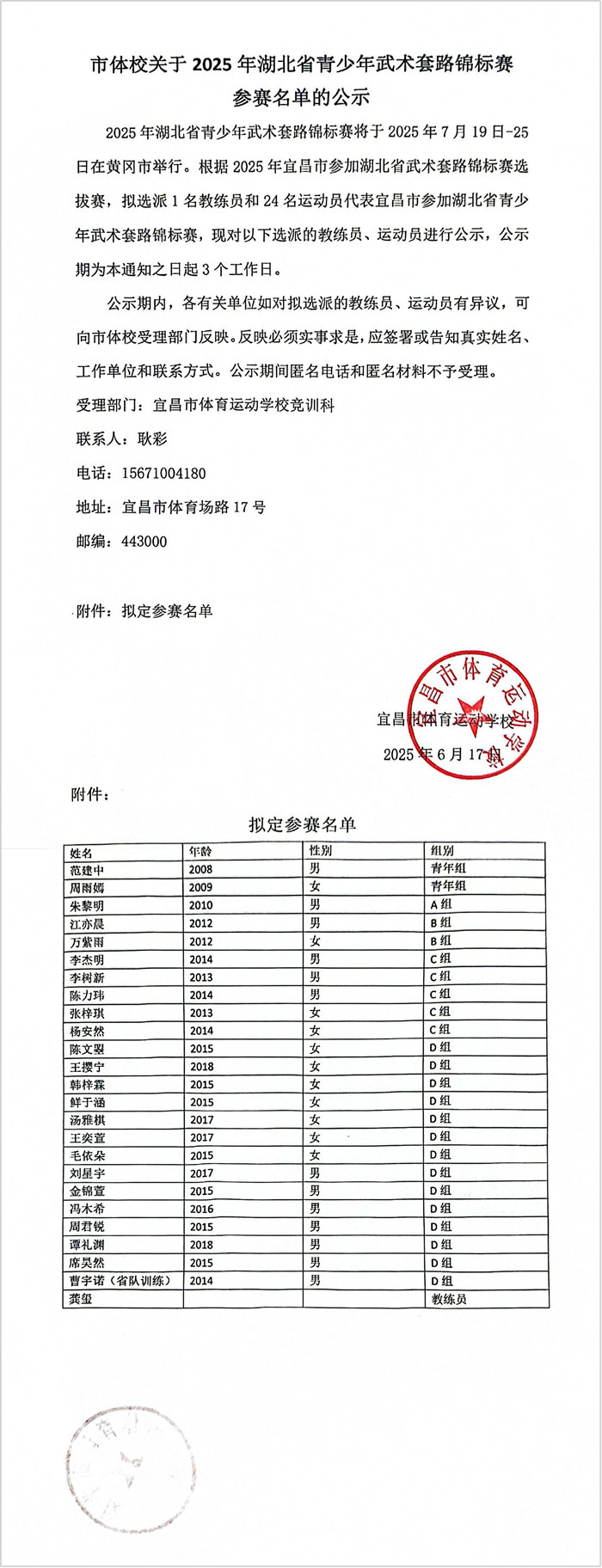 市体校关于2025年湖北省青少年武术套路锦标赛参赛名单的公示