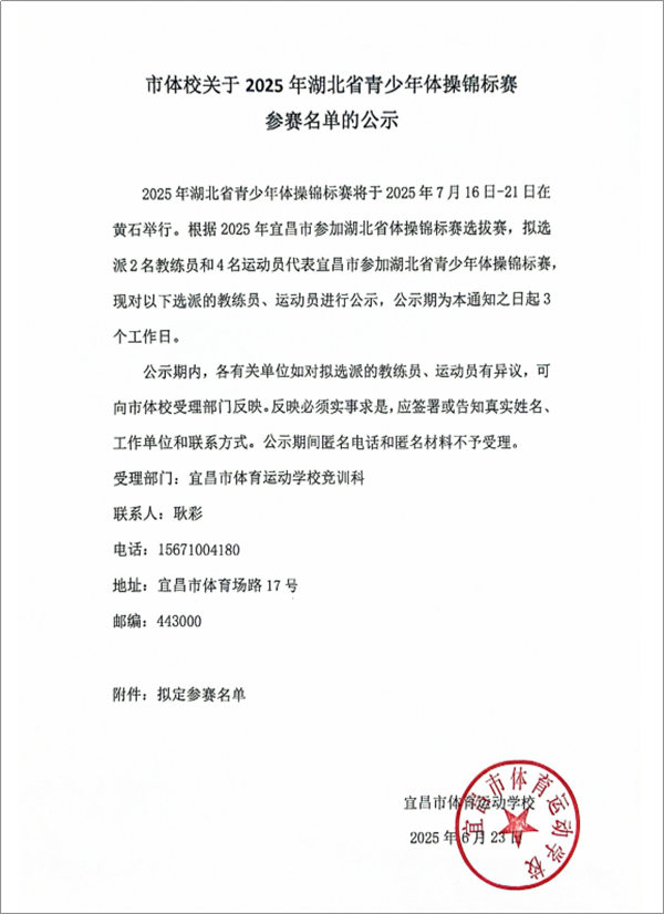 市体校关于2025年湖北省青少年体操锦标赛参赛名单的公示