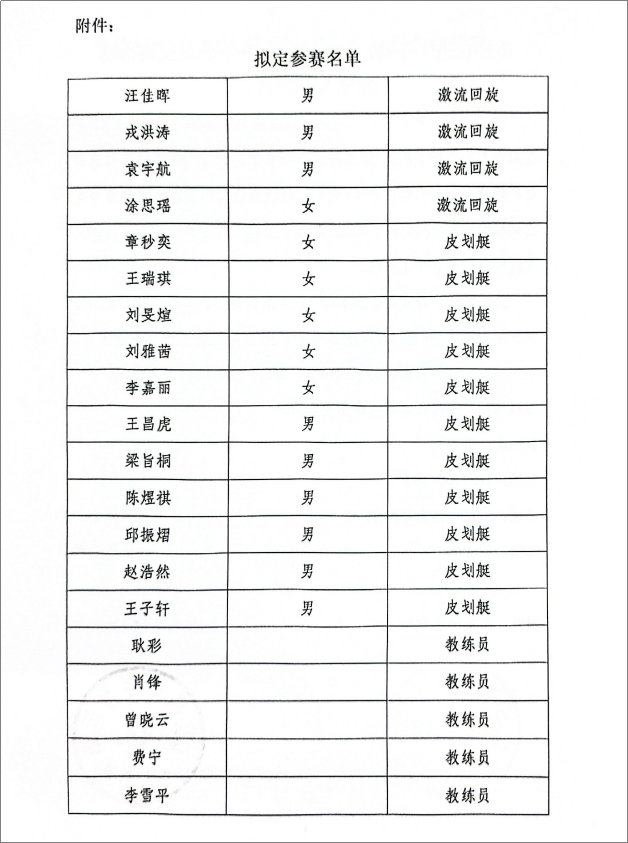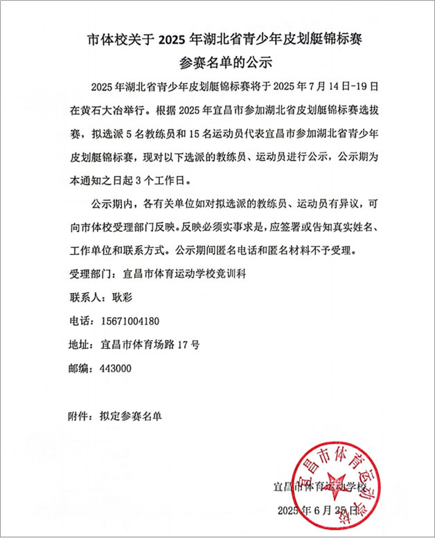 市体校关于2025年湖北省青少年皮划艇锦标赛参赛名单的公示