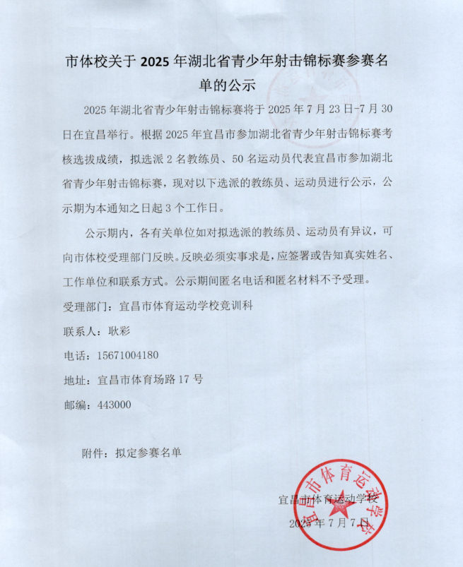 市体校关于2025年湖北省青少年射击锦标赛参赛名单的公示