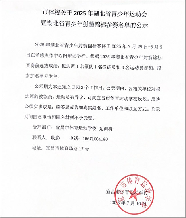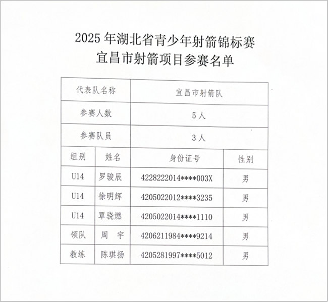 市体校关于2025年湖北省青少年运动会暨湖北省青少年射箭锦标参赛名单的公示