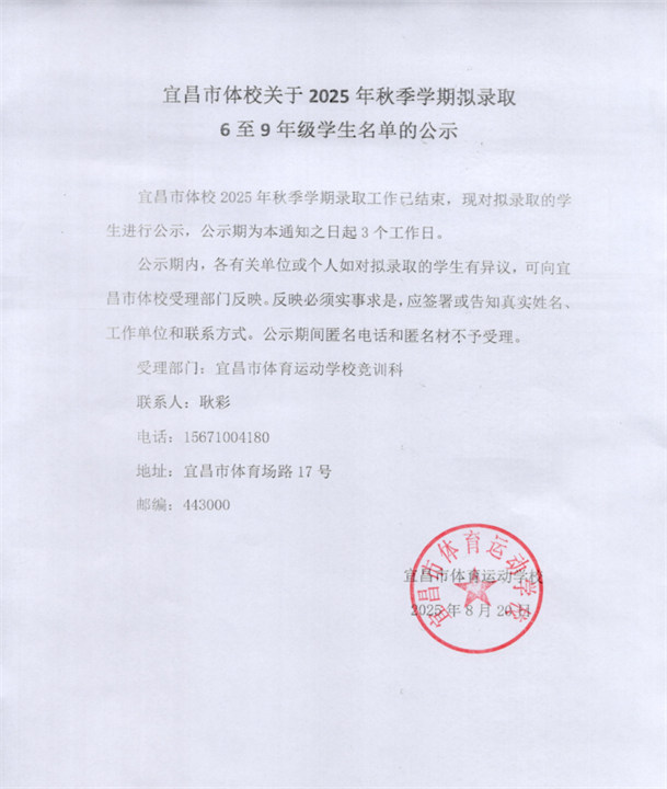 宜昌市体校关于2025年秋季学期拟录取6至9年级学生名单的公示 |