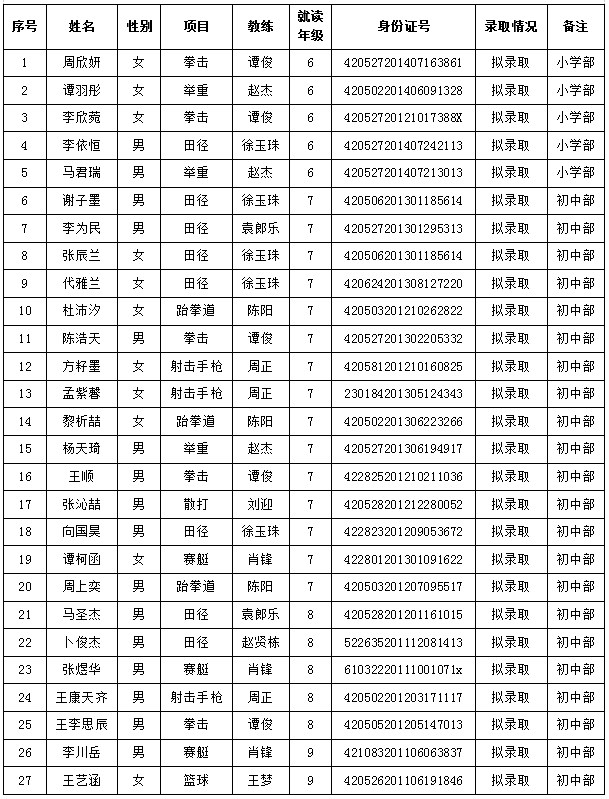 宜昌市体校2025年秋季学期拟录取6-9年级学生名单