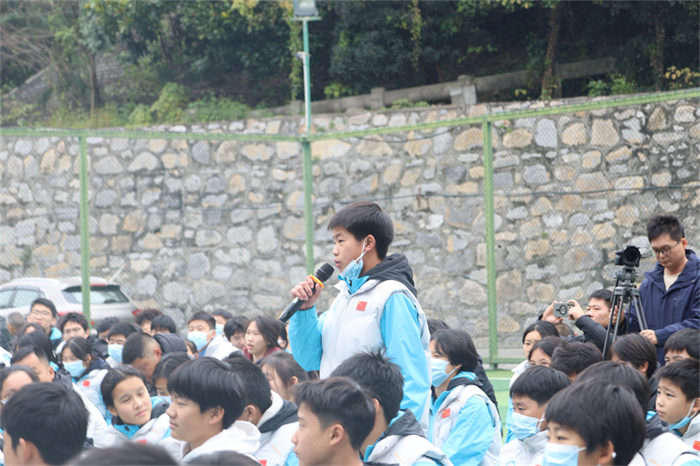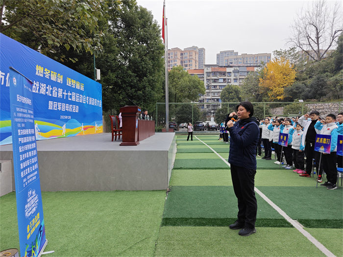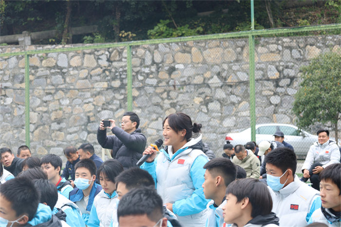 校长王燕珍作动员讲话。她指出所有运动员要向冠军汪周雨学习。强调了本次冬训是省运会前的关键冲刺期,她提出了四点要求和希望:明确目标,全力迎战;科学训练,严格备战;协同联动,聚力备战;严守底线,安全备战。激励全体师生坚定信念,携手并肩,攻坚克难,全力投入这场冬训攻坚战。