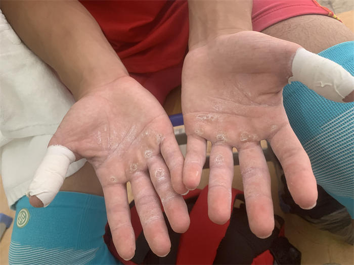 他们的双手因长期训练结满老茧,厚厚的茧子规律地出现在手掌关节处,坚硬如铁。本次61公斤级举重冠军朱宝锐说,他们手上的茧子过一段时间就得剪一层,不然太厚硌得疼。但剪过后不久,茧子又会迅速变厚。听他讲述的人心都硌疼了,他脸上却是含笑的,这就是热爱吧!