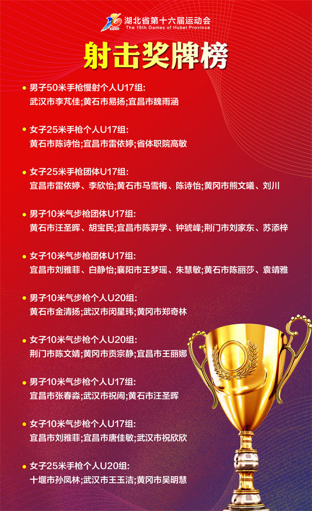 湖北省第十六届运动会青少年体育类(体校组)射击比赛4月11日共进行10场比赛, 产生10块金牌。