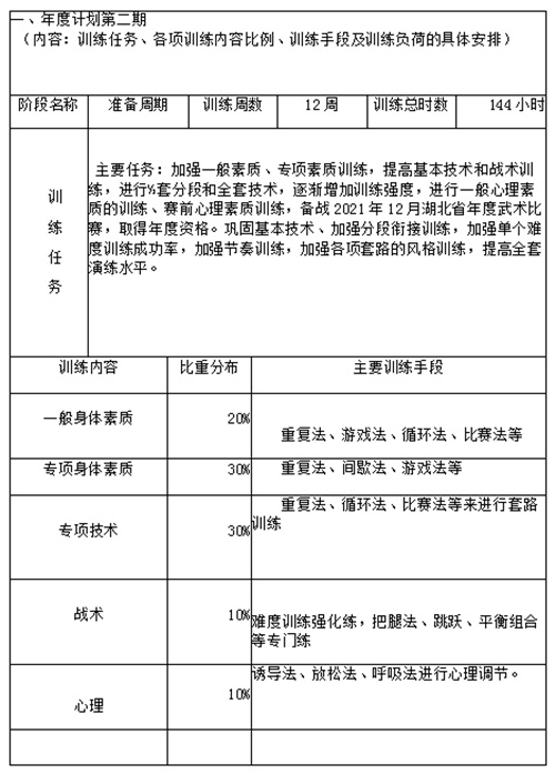 准备周期: 主要任务:加强一般素质、专项素质,提高基本技术和战术,进行½套分段和全套技术,逐渐增加训练强度,进行一般心理素质、赛前专项心理素质训练。
