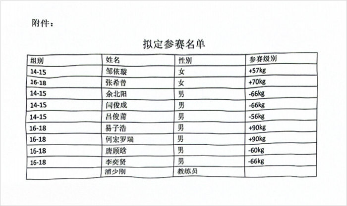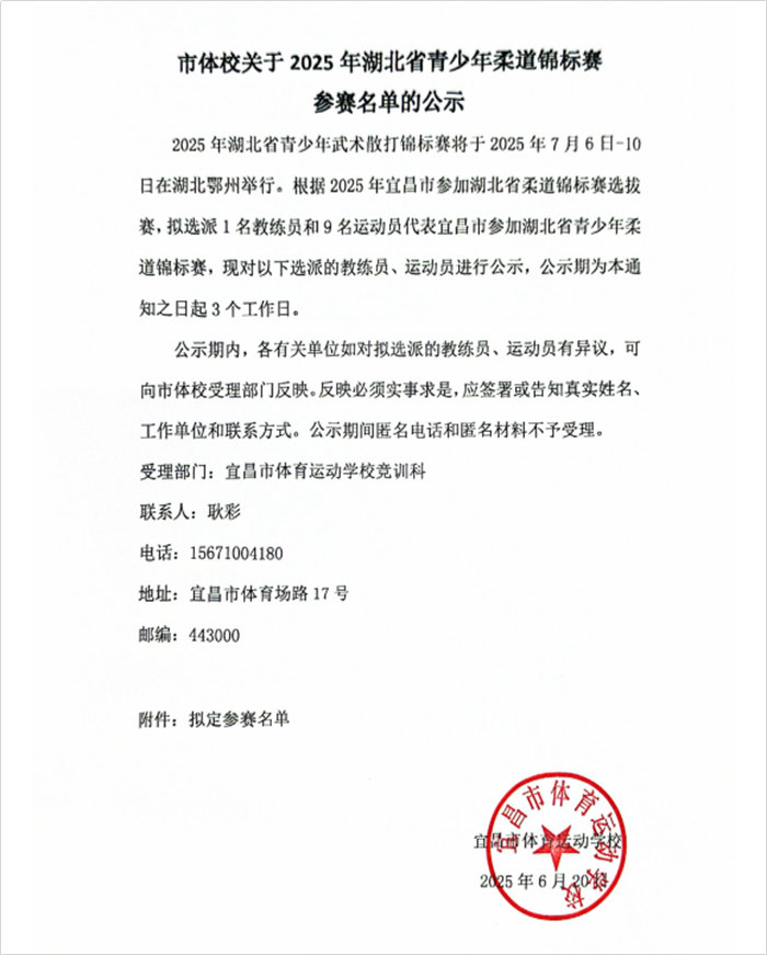 市体校关于2025年湖北省青少年柔道锦标赛参赛名单的公示