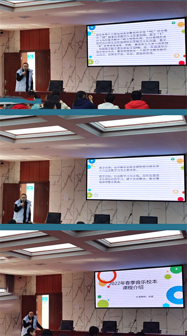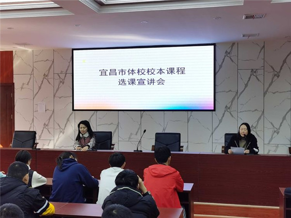 2022年3月10日,宜昌市体校校本课程选课宣讲会在阶梯教室顺利进行。今年我校共开设了七门校本课程:篮球,羽毛球,田径,经典阅读与朗诵,趣味英语,音乐以及舞蹈,校领导与教务科进行了选课宣传与动员,四名开课老师针对课程内容和要求进行讲解。