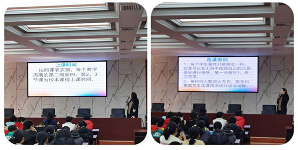教务科长苏家梅就校本课程的必要性分别从国家层面、学校层面、个人层面进行了宣讲,隆重介绍了七门校本课程的老师,并对上课时间和选课规则进行了说明。
