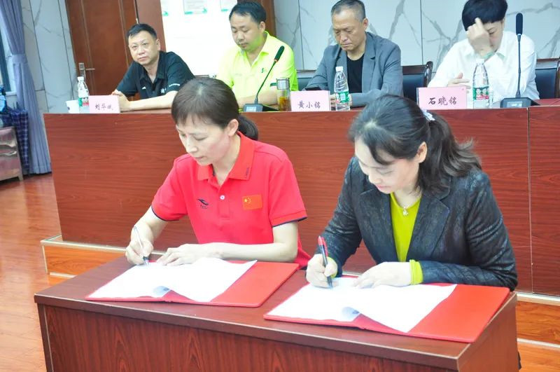 湖北省崇仁体育培训中心少儿体校校长陈红与市体校校长王燕珍共同签定合作协议书。