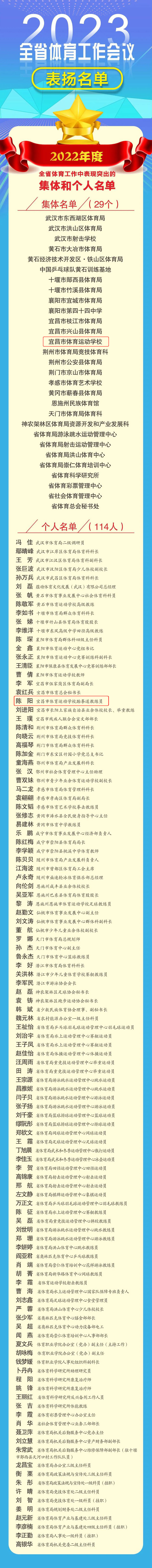 2月15日上午,在2023年全省体育工作会议上,省体育局副局长郑李辉宣读省体育局表扬通报,在2022年度全省体育工作中表现突出的集体:宜昌市体育运动学校等29个单位;个人:市体校跆拳道教练陈阳等114名个人。
