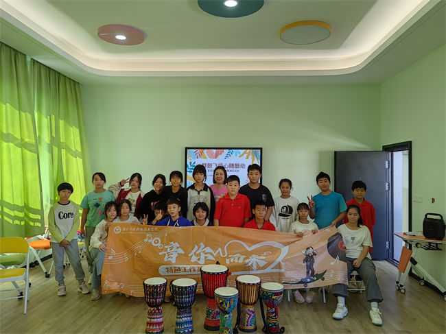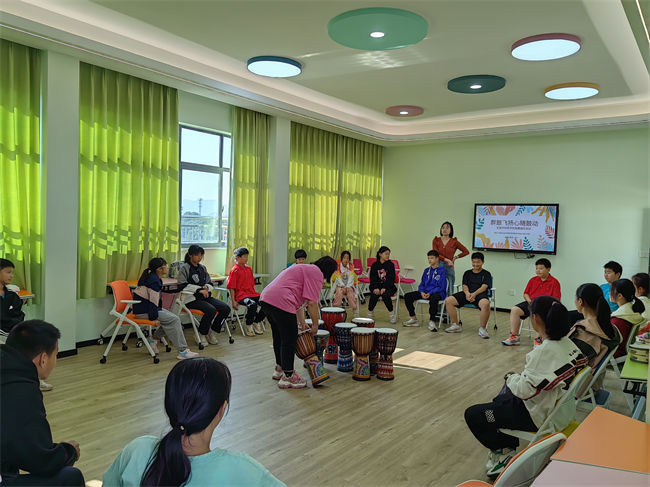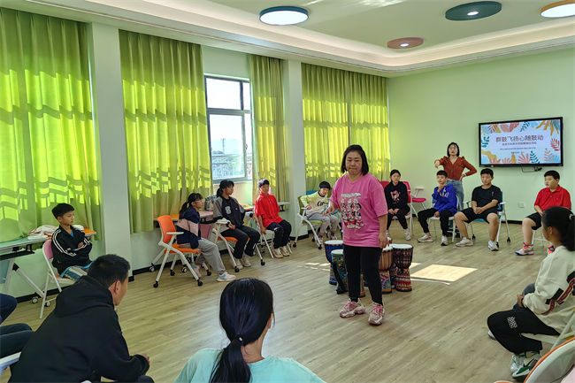 同学们跟随老师的指导,利用各种乐器享受创作音乐的快乐。有些平时较为调皮的同学在这次心理疏导中表现得很不错,沉浸在非洲手鼓、音叉、沙蛋带来的喜悦之中,活泼好动都转化为有旋律的合奏。