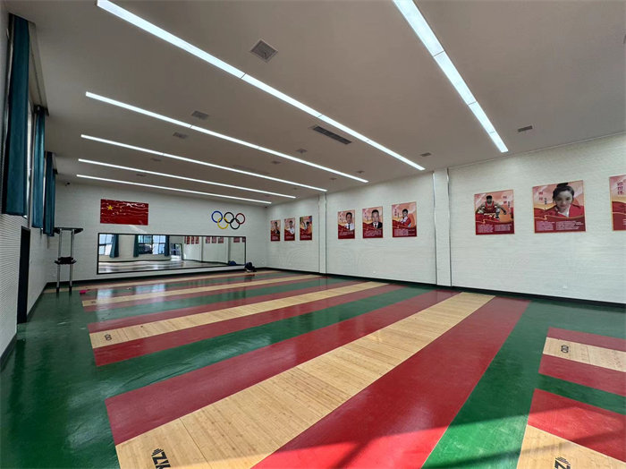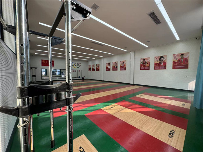 宜昌市体育运动学校举重房是目前宜昌市范围内最规范、最科学、最标准的举重场地。原本因使用年限太长导致地面不平整,造成运动员训练动作变形和运动损伤,严重影响训练质量,存在较大的安全隐患。新的举重房全系采用国际举联认证的张孔杠铃制造商提供的产品和工艺,地面采用采用嵌入式举重台, 中间为1米宽实木举重台,两边杠铃缓冲区采用宽各90cm,厚度为10cm专业地胶进行嵌入,改善了地面的平整度和,同时也大大降低了运动员训练动作变形和损伤的风险。