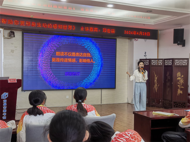 参观完图书馆后,同学们来到五楼多媒体会议室,参加了一场精彩的朗诵启蒙指导课。湖北省优秀文艺志愿者、普通话测试员、朗诵艺术家协会理事邓宏颖老师,用她富有感染力的声音和生动的实例,为同学们讲述了《让朗读帮助你更形象生动的感知世界》,为同学们带来了一场关于朗诵的盛宴。