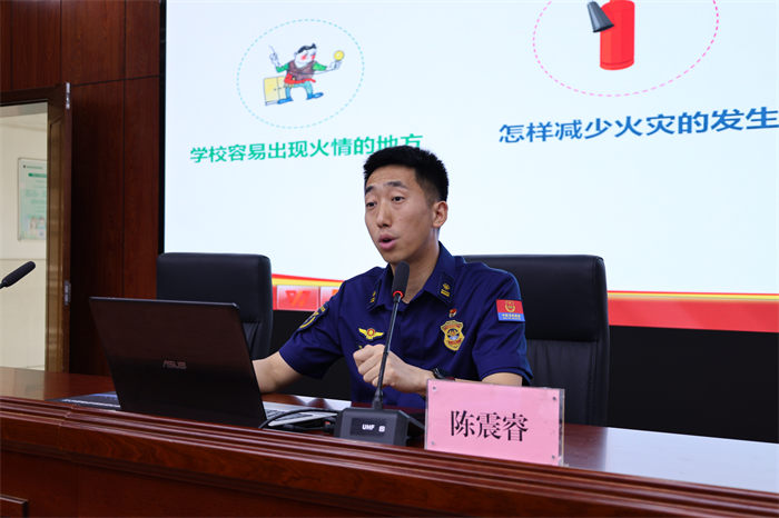 宜昌消防救援支队东山支队特勤班陈震睿班长,通过案例视频从学校公寓容易发生火情的物品到怎样减少火灾的发生、发生火灾该怎么办等几个方面对师生进行了消防知识普及。