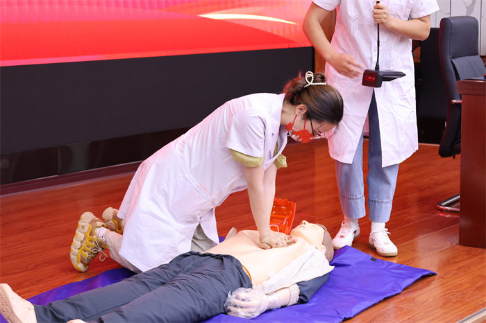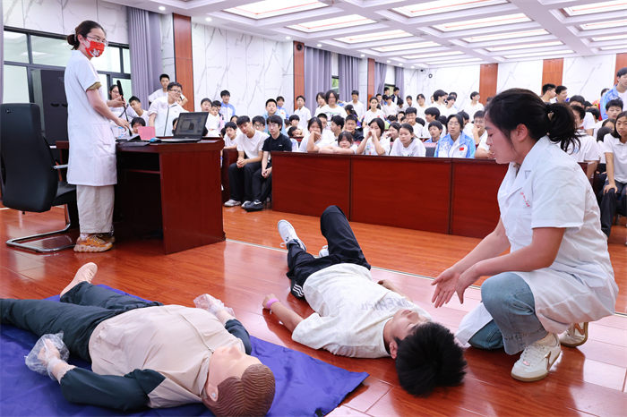 讲座上学校科研及医护人员,陈世晖和龚师弘老师通过情景剧的方式,为师生讲解示范了紧急抢救过程中的心肺复苏和人工呼吸的方法以及AED的使用方法。进一步加深了同学们对紧急救援方法的理解。