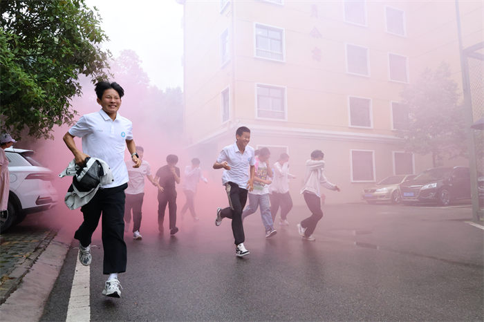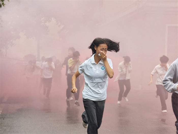 随着校园内消防警报声骤然响起,模拟学生公寓突发“火情”,浓烟迅速蔓延。学校立即启动消防应急预案,应急通道开启,各班级教师迅速组织学生用湿毛巾捂住口鼻,弯腰沿疏散通道有序撤离至操场安全区域。副校长张柱国和消防士官对疏散过程进行了点评。
